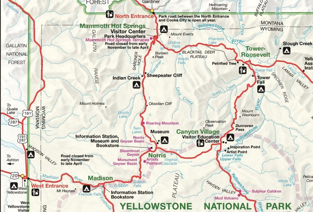 Gibbon Falls, Artists Paintpots, Norris Geyser Basin, Obsidian Cliff, Mammoth Hot Springs, Gardiner, Lamar Valley, Soda Butte, Calcite Springs, Tower Falls, drive through Mount Washburn.