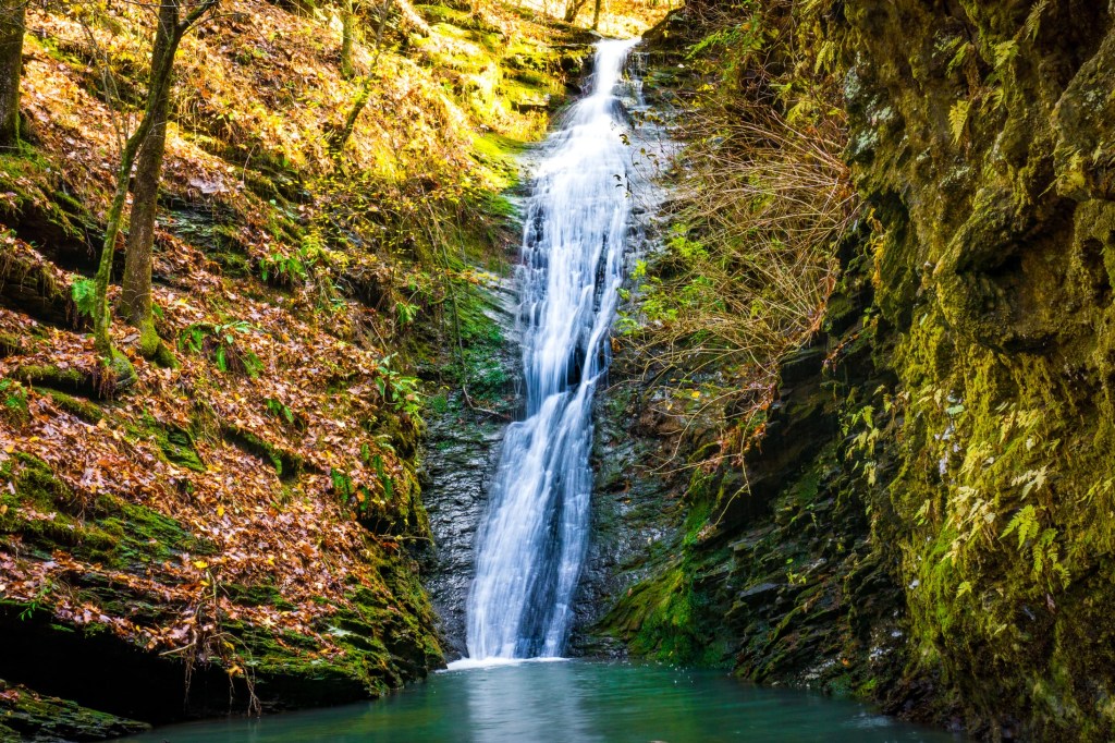 In Beavers Bend State Park there are hundreds of honking trails but there are a few that lead to beautiful hidden waterfalls. One is thunderbird falls which is a beautiful waterfall tucked into the forest. At the bottom is a small pool of crystal clear water.