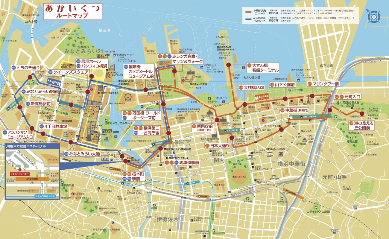 Akaikutsu khởi hành tại điểm lên xe số 4 trước ga JR Sakuragicho. Các bạn hãy lưu ý vì có 2 lộ trình riêng rẽ là lộ trình Minatomirai (M) và lộ trình Chinatown, Motomachi (C).